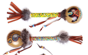 Hand Painted Zuni Deer Skin Beaded Ceremonial Rattles | Rabbit Hair and Leather Fringe