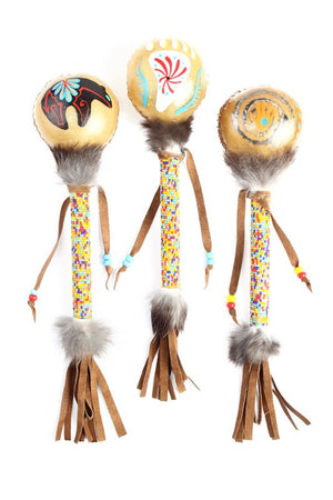 $28 ea. #922N-ZR/B (0047) Hand Painted ZUNI Deer Skin Beaded Ceremonial Rattles | Rabbit Hair and Leather Fringe